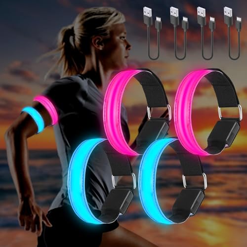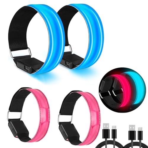 4 stycken LED-armband USB, LED reflekterande band, ljusarmband, löparmband, ljusband, barn, ljusband, reflektorband, ljus, barn, nattsäkerhet, ljus för jogging, löpning, löpning, sport (2 rosa, 2 blå)