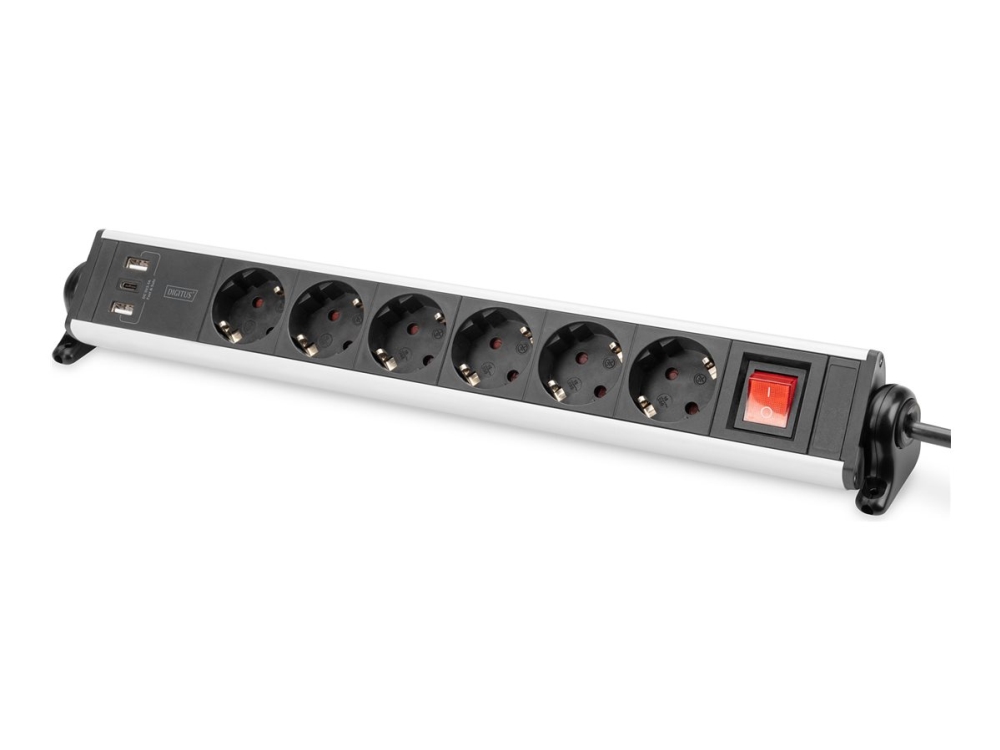 Digitus - Effektband - Med 3 St Usb-Portar - Ac 100-240 V - 3680 Watt - Ingång: Cee 7/4 - Utgångskontakter: 6 (Power Cee 7/3, 2 X Usb, 24 Pin Usb-C) - 1.5 M Sladd - Silver, Svart