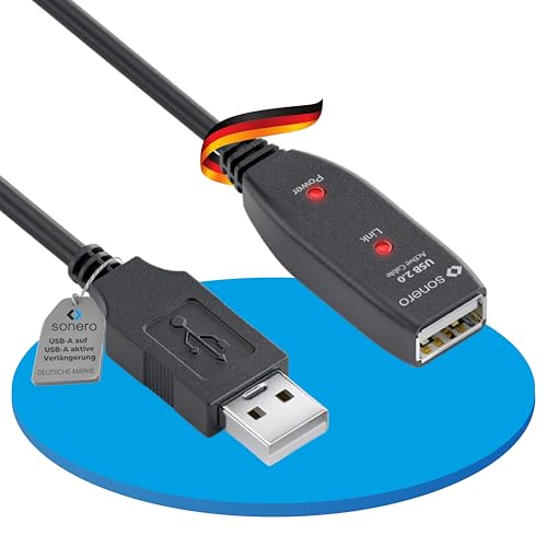 sonero® USB 2.0-kabel, aktiv förlängningskabel med signalförstärkare, datakabel, USB-A-kontakt till USB-A-uttag, 480 Mbit/s, 15,0 m, svart