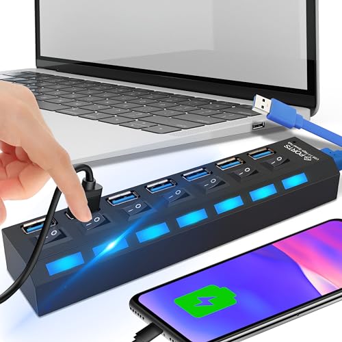 Retoo USB Hub 3.0 7-port USB-distributör 5 gb/s, datanav med separat brytare, nätdelsport med enskilda LED-strömbrytare, kompatibel med bärbar dator, PC och andra USB-enheter