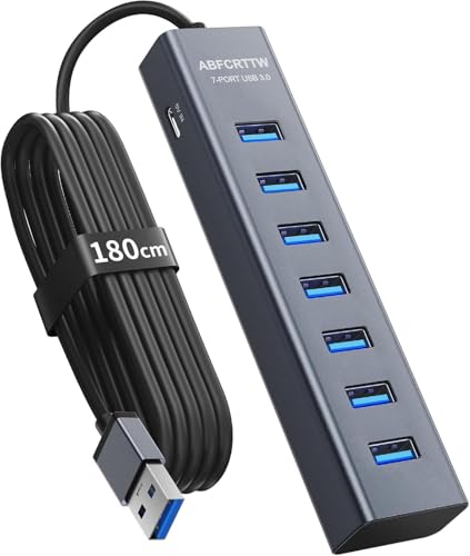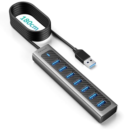 Gimundo GM7U 7-port USB HUB 3.0 aluminium, 1,8 m lång kabel med 5 V/3 A Type-C strömanslutning, USB-distributör 3.0 för PC-bärbar dator, stationär dator, PS4, PS5, äldre Mac