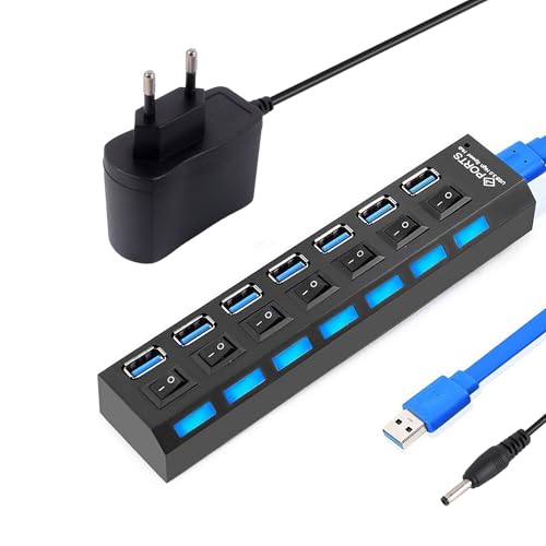 Gimundo PG7U USB-hub 3.0, 7-port USB-distributör, 1 m lång kabel med 5 V/3 A strömingång, flera USB-kontakter för PC bärbar dator, äldre MacBook, PS4, PS5, flashdrive, tangentbord, mus GGM-PG7U-U3-10