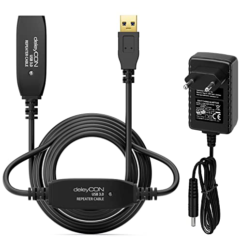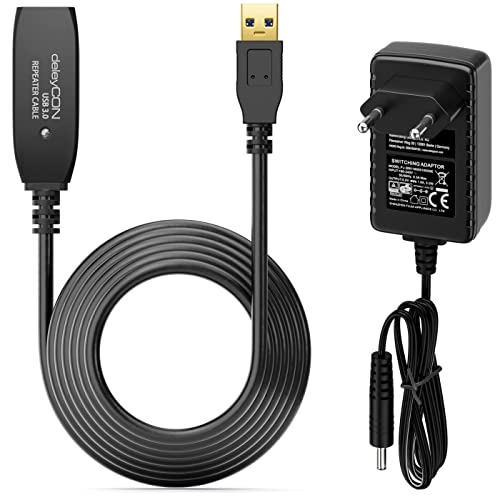 deleyCON 10m Aktiv USB 3.0-Kabel Aktiv Förlängning med 2 Signalförstärkare och Strömadapter USB3.0 Repeaterkabel Förlängningskabel PC Dator Skrivare Skanner