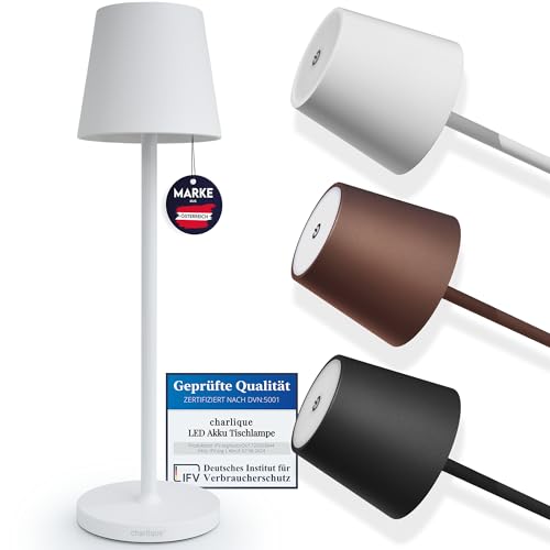 charlique® Dinner Light - LED bordslampa i vit färg, för inomhus och utomhus | design table lamp med USB port, steglöst dimbar | uppladdningsbar, varm ljusfärg, lång brinntid