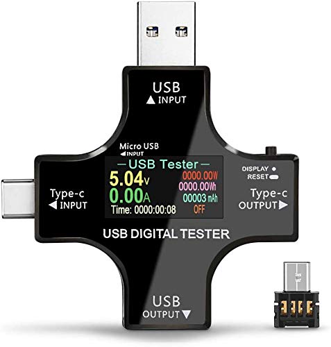 USB-effektmätare, multifunktionell, 2-i-1 typ C USB-testare, digital multimeter med LCD-skärm, spänning, ström, effektkapacitet, temperatur, arbetstidsdetektor (förpackning med OTG-adapter)
