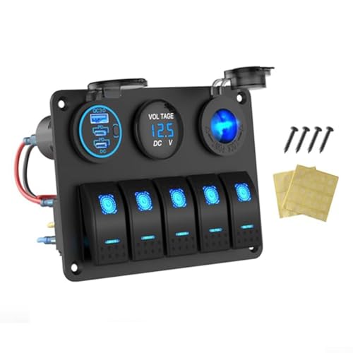 Besttoolifes Vattentät marin växelpanel 12-24 V aluminium 3 USB-portar 78 W snabbladdande PD 3.0 QC 3.0 blå LED voltmeter 150 W uttag för lastbil båt husvagn