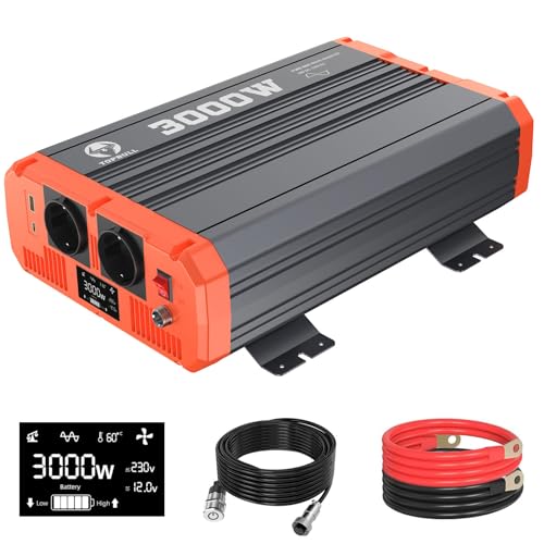 FLAMEZUM 3000W Ren Sinus Spänningsomvandlare 12V Till 230V Power Inverterare Med Fjärrkontroll LED-display och 2 EU AC-uttag Och 2 USB-port För Bil, Husvagn, Båt, Camping