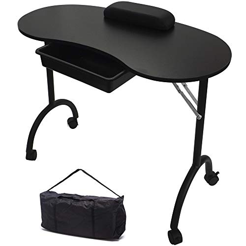 RayGar Svart bärbar hopfällbar mobil manikyr nagelkonst skönhetssalong bord skrivbord med utdragbar låda + handledsstöd + bärväska