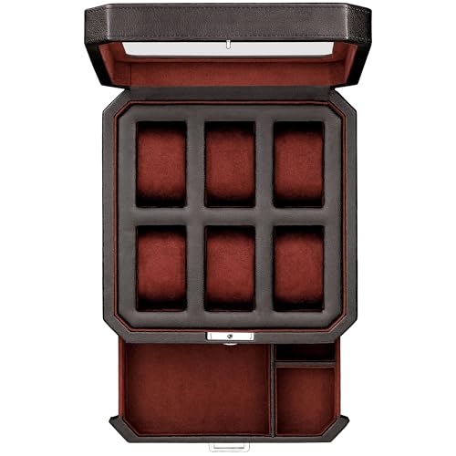 ROTHWELL 6-facks klockbox i läder med utdragbar låda, lyxig smyckesförvaring, låsbar displaybox, lock i äkta glas, klockskrin för män och kvinnor (svart/röd)