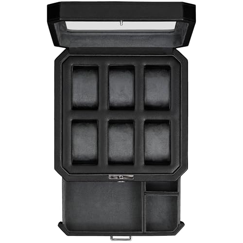 ROTHWELL 6-facks klockbox i läder med utdragbar låda, lyxig smyckesförvaring, låsbar displaybox, lock i äkta glas, klockskrin för män och kvinnor (svart/grå)