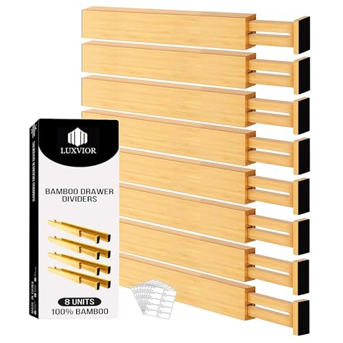 LUXVIOR Expandable Bamboo Drawer Dividers 8 pack with labels(17"-22") Drawer Organizer for Kitchen, Clothes,Utensils,Silverware,Dresser,Office,Desk