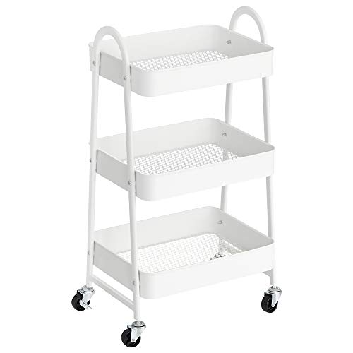 SONGMICS 3-Tier Rolling Cart, Metal Storage Cart, Kitchen Storage Trolley with 2 Brakes and Handles, Utility Cart, Easy Assembly, for Painting Utensils Sovrum Tvättstuga, Vit BSC068W01