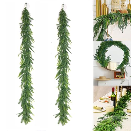 Juldekor, konstgjorda Norfolk tallgirlanger, äkta touch vintergirlang, grön konstgjord grönska girlang för bord, mantel, vägg, inomhus, utomhus juldekorationer 180 cm (6 fot) (2 st grön)