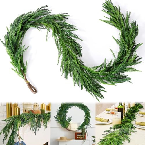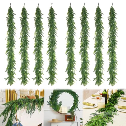 1,8 m konstgjorda Norfolks tallgirlanger, äkta beröring vintergirlang, grön konstgjord grönskande girlang för bord, mantel, vägg, inomhus, utomhus juldekorationer (8)