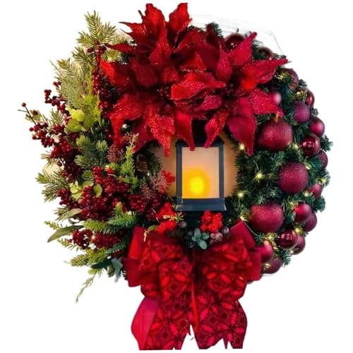 Julkransar, julkransar för ytterdörren med ljus och rosett 40 cm julkrans kreativ konstgjord juldörrkrans för utomhus inomhus juldekorationer, röd