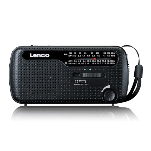 Lenco MCR-113BK nödradio med vev, solar, powerbank, FM/KG-radio, SOS-larm, LED-ficklampa, USB-C, 1 200 mAh, 15 timmars drifttid, kompakt och bärbar, perfekt för utomhus- och krisfall