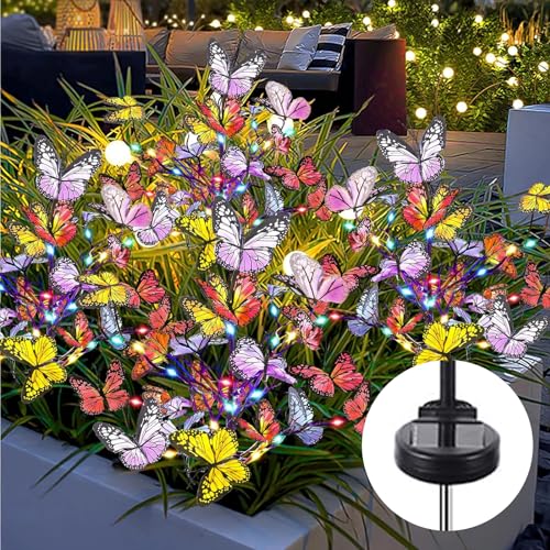 Svängande solträdgårdsljus i vinden med fjärilar, set med 2 vattentäta dekorativa lampor, färgskiftande fjärilsdesign, utomhus sol LED-lampor för uteplats