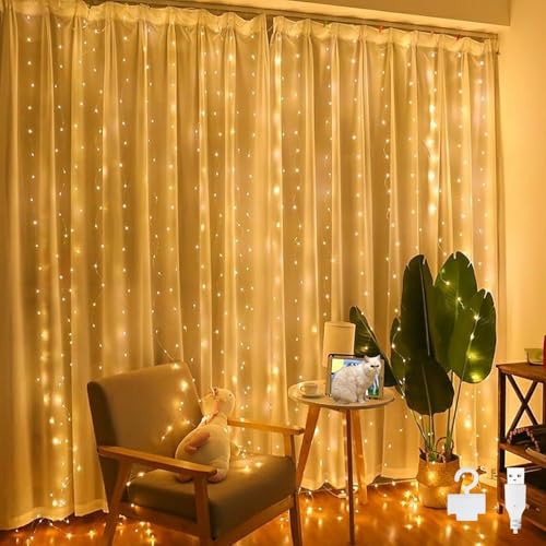 Bowfar 300 LED-ljusgardin, 3 x 3 m, USB-ljusslinga, 8 lägen med fjärrkontroll, minnesfunktion, IP65, vattentät, ljusslingor, gardin för inomhus, utomhus, dekoration, jul, bröllop, fest, varmvit
