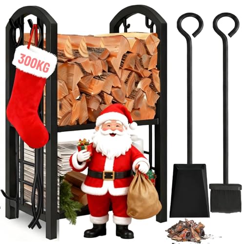 Amagabeli Vedhylla med 4 spisverktyg, 72 x 46 x 30 cm, vedställ för öppen spis eller kamin, passar även utomhus, med 2 hyllor i trä, av smidesjärn, vedförvaring