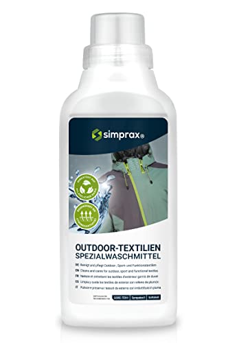 SIMPRAX Tvättmaskin flytande tvättmedel för tekniska och utomhuskläder – för Gore-Tex, Softshell, Sympatex, Lycra & Fleece – förnyar andningsförmåga, eliminerar lukt och smuts – miljövänlig, 500 ml