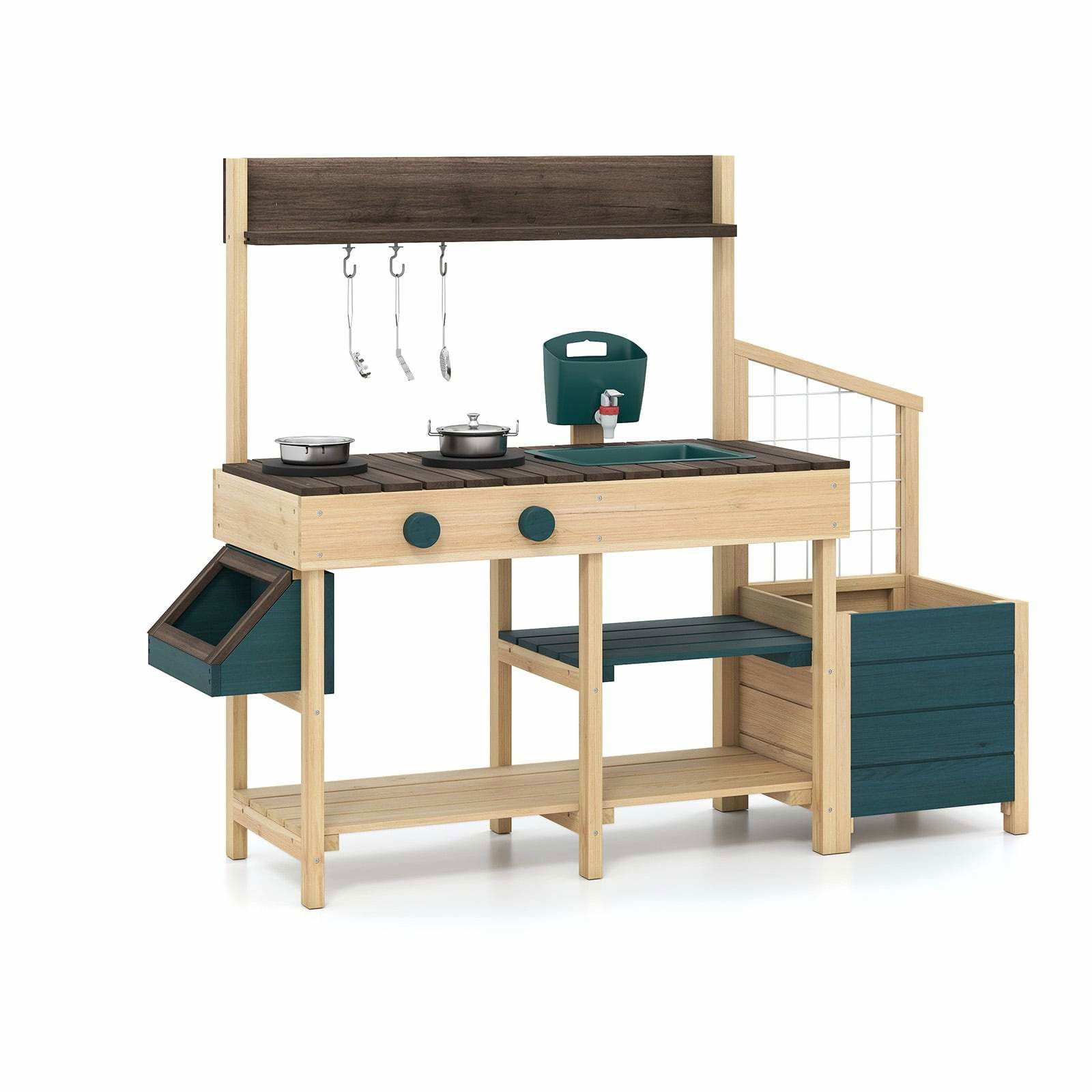 Utomhuskök för barn med ler, diskho och växtlåda