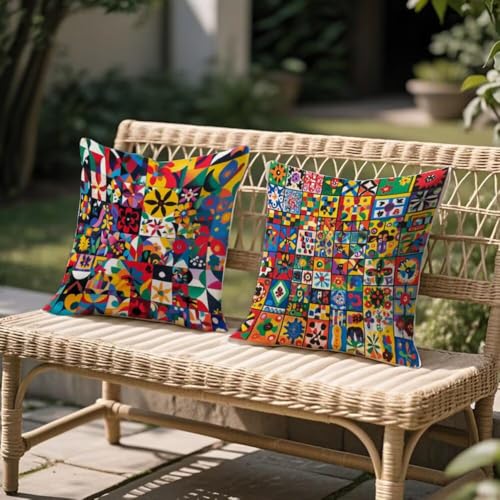 Färgglada kuddöverdrag set med 2, utomhuskuddar 50 cm x 50 cm, lapptäcke dekorativa kuddar dubbelsidigt mönster, trädgårdskuddöverdrag vattentät sammet prydnadskudde överdrag för uteplats soffa