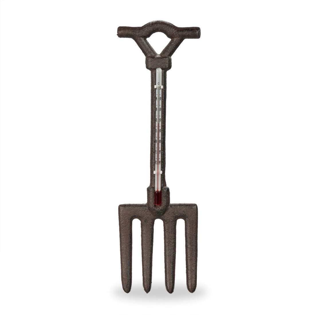 Relaxdays utomhustermometer analog gjutjärn, trädgårdstermometer vägg, antik mistgaffeldesign, H x B: 30 x 9 cm, brun, 30 x 9 x 1,5 cm
