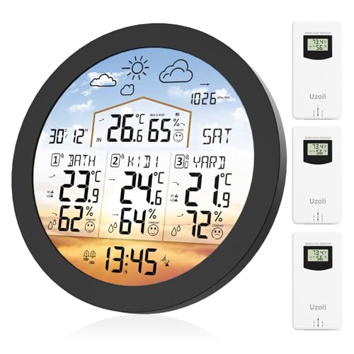 Uzoli Väderstation med 3 utomhussensorer, 6,5 tum stor färgskärm, DCF-radioklocka, väderprognos, inom-/utomhustermometer, hygrometer, lufttryck, mögelrisk och komfortnivå — EM3567