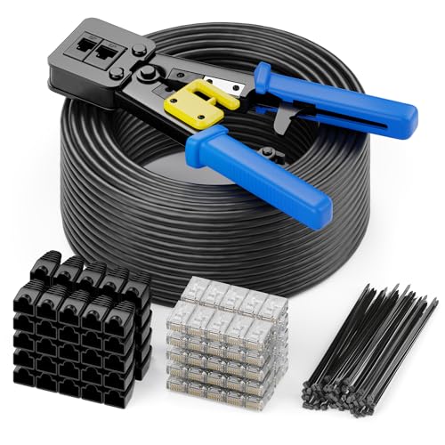 deleyCON 100m CAT6 Installationskabel Patchkabel Installationsset Utomhus Inomhus Inkl. Krymptång Buntband & 50 RJ45 Pluggar - UTP 250 MHz AWG 24 CCA - UV- och Väderbeständig LDPE-Mantel - Svart