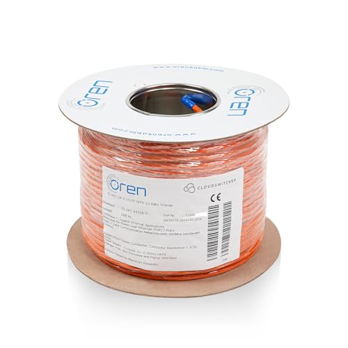 Oren Ethernet-kabel CAT6 100 m – EC400 U/UTP HFFR B2ca 23 AWG orange – IEEE 802.3: 10Base-T, 100Base-T, 1000Base-T, IEEE 802.5 16 MB, ISDN, 400Mhz, TPDDI, ATM ström över Ethernet (EPod / PoE+