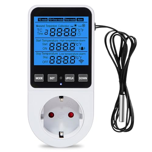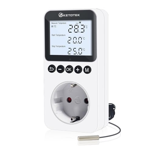 KETOTEK Digital Termostatuttag Temperaturkontroll med 3 Meter Sond, Termostat Plugg med Bakgrundsbelysning, Temperaturregulator med Uttag 230V för Växthus Inkubator, Uppvärmning/Kylning Läge