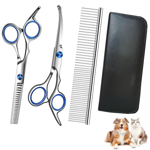 Elfirly Professionell hundtrimningssax, kit i rostfritt stål, rund spets, skärande böjd sax, uttunningssax, vård, kam, husdjurshår, trimningssax med extra sax för hundar och katter