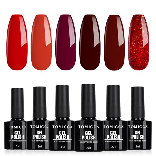 TOMICCA UV Nail Polish Set, 6 Colors Red & Red Glitter Nail Polish, Soak UV/LED Gel Nail Polish, Gift for Nail Studio DIY Home, 10ml
