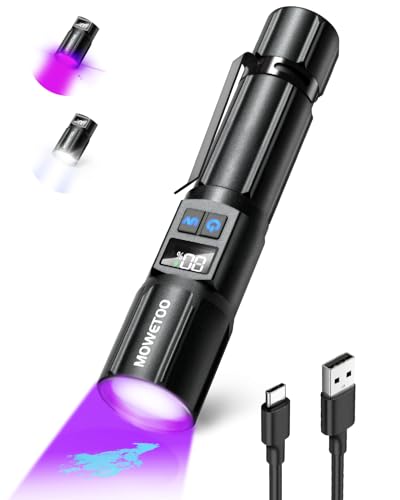 MOWETOO ficklampa uppladdningsbar – LED UV-lampa svart ljus 2-i-1, 395 nm zoombar UV-ljusfack med 5 lägen och LCD-display för urinundersökning av husdjur, sedelkontroll, utomhus