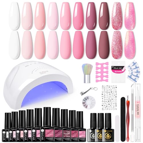 UR SUGAR UV nagellackset med UV-lampa 48 W, gel nagellack startset nagellack startset med bas och toppmatta coat ros glitter gelnaglar gellack naglar nagelstudio set