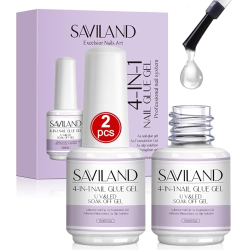 Saviland Gellim, 2 st, 15 ml, 4-i-1, extra stark nagellim, basgel för falska naglar och tryck på naglar, UV-nagellim, långvarig borste på nagellim-gel för akrylspetsar, UV/LED-lampa härdning behövs