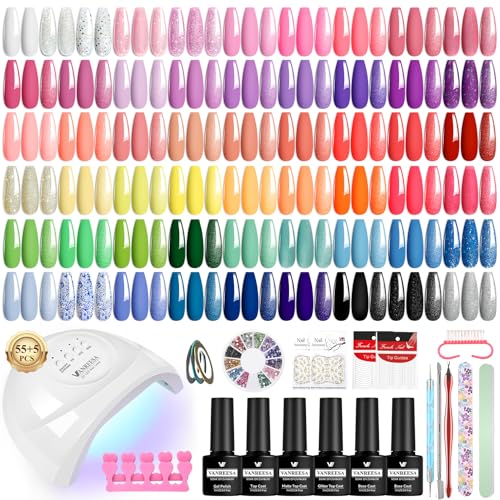 VANREESA 55 färger halvpermanent nagelkit, halvpermanenta naglar komplett kit 77 st med matt botten glitter beläggning UV-lampa naglar 48 W och manikyrverktyg, present till kvinnor