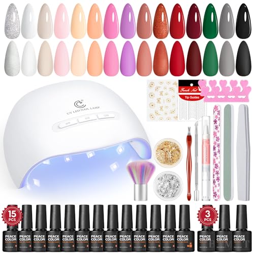 PEACECOLOR 31PCS Nagelset Gel Naglar Startset, 15 färger UV nagellack med UV-lampa, bas och topplack matt med verktyg DIY Manikyr hemma