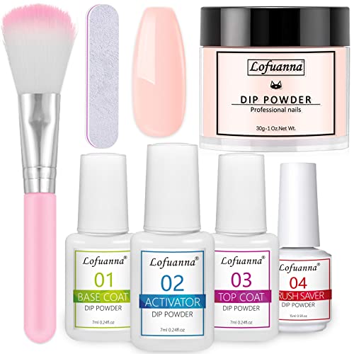 Lofuanna Dip Powder Nail Kit Starter - Nude rosa dopppulver med bas- och topplack och aktiverare och borstsparare, ingen UV/LED behövs, gör-det-själv fransk nagelkonst manikyr, lätt att applicera för