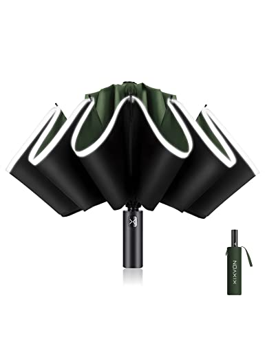 XIXVON Paraply Pro (10 Ribbor, GröN) | UPF 50+ 99% UV-Skydd, Reflekterande SäKerhetsremsa, Robust VindtäT, BäRbar på Resan, Automatisk | OmväNt FäLlbart Paraply