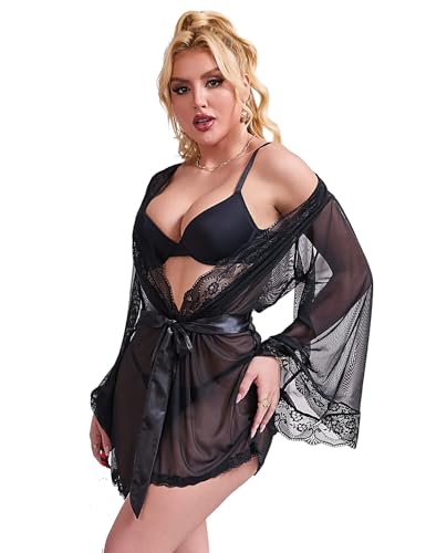 Nattlinne Dam Sensuell Nattskjorta Spets med Bälte Kimono Pyjamas Badrockar stor Storlek Långärmad Sovrumsklänning V-hals med G-string(Svart,3XL-4XL)