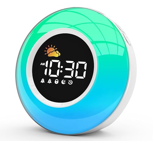 WanderGo Digital väckarklocka för barn, barnväckarklockor, sängbord, lätt att läsa med 7 färger, ljusströmbrytare, snooze, temperatur, kalender, musik för de som sover djupt barn, resor sovrum kontor