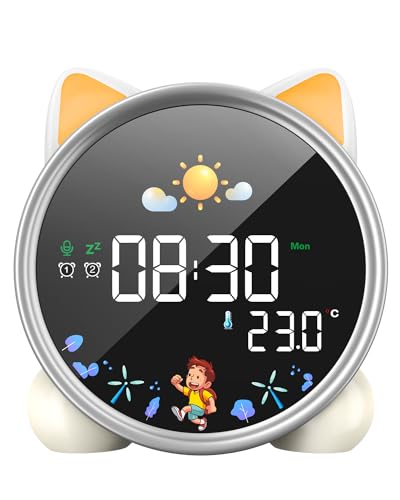 Lemnoi Barn Väckarklocka, Barnklocka Utbildningsklocka, Sömnträningsklocka, Barn Morgonklocka Med Nattljus, Snooze, OK att Vakna, Sömnmusik, Dubbel Alarm, Timer, Nedräkning, Temperatur, Katt