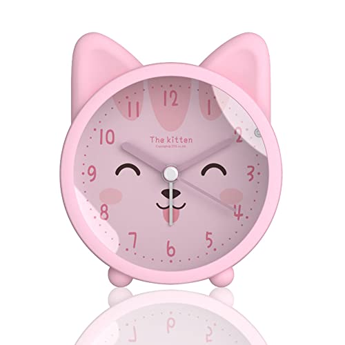 Roadtime Vägtid söt djur väckarklocka för barn, icke-tickande kanin/katt/hjortklocka, skrivbord vid sängen tyst väckarklocka med bakgrundsbelysning (katt, rosa)