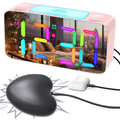 RGB Höga Vibrationer Väckarklocka för Djupsovare, Hörselskadade,Döva, LED Digital Väckarklocka med Sängskakare & Vecka för Barn Seniorer Sovrum, Två Larm, Stor Skärm med 8 Färger, Nattlampa,4 Dimmers