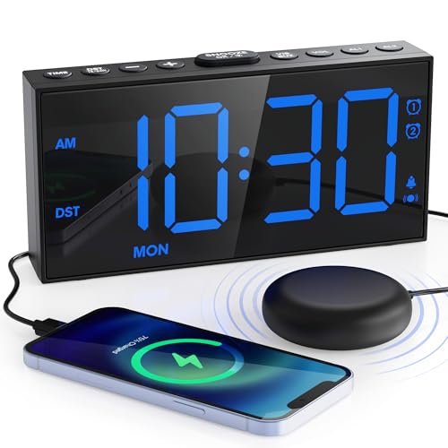 Extra högljudd väckarklocka med sängskakare, vibrerande väckarklocka för tung sömn, hörselskadade eller döva, ungdomar, dubbel väckarklocka, stor display, USB-laddare, dimmer, snooze-knapp