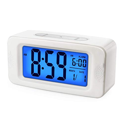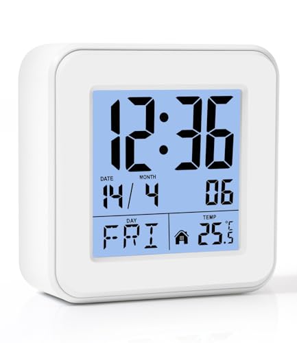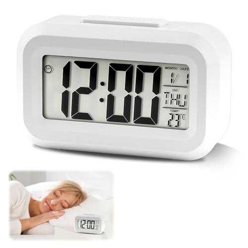 Plumeet Digital väckarklocka, lyser upp hela natten, 4 '' LCD-display som visar tidslarmdatum, sängklockor med snooze för sovrums kök Kontorsbatteri (vit)