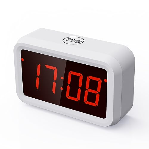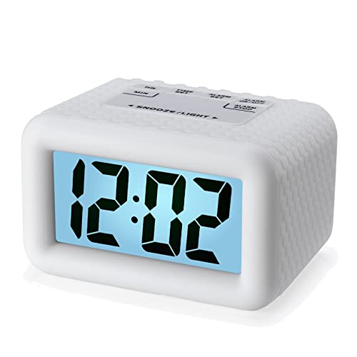 Plumeet Digital väckarklocka med snooze och nattljusfunktion, stor LCD-skärm Reselarmklocka enkel att använda, stigande ljudlarm och handhållen storlek, batteridrivna (vit)