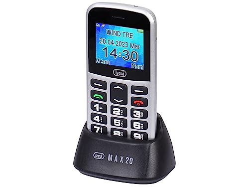 Trevi MAX 20 äldre telefon stora knappar, 1,77 tum LCD-skärm, mobiltelefon med SOS-funktion, röstupprepa siffror, laddningsbas, väckarklocka, lagra upp till 150 nummer, silver