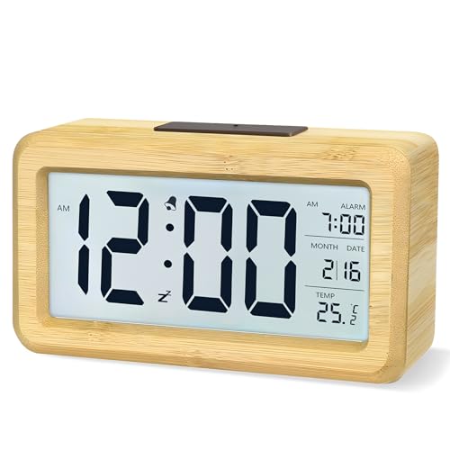 aboveClock Digital Väckarklocka, Träbordsklocka med Stort LCD-bakgrundsbelyst Display, Temperatur, SNOOZE-funktion, Ljussensor, Drivs av 3 AAA-batterier 【Bambu】